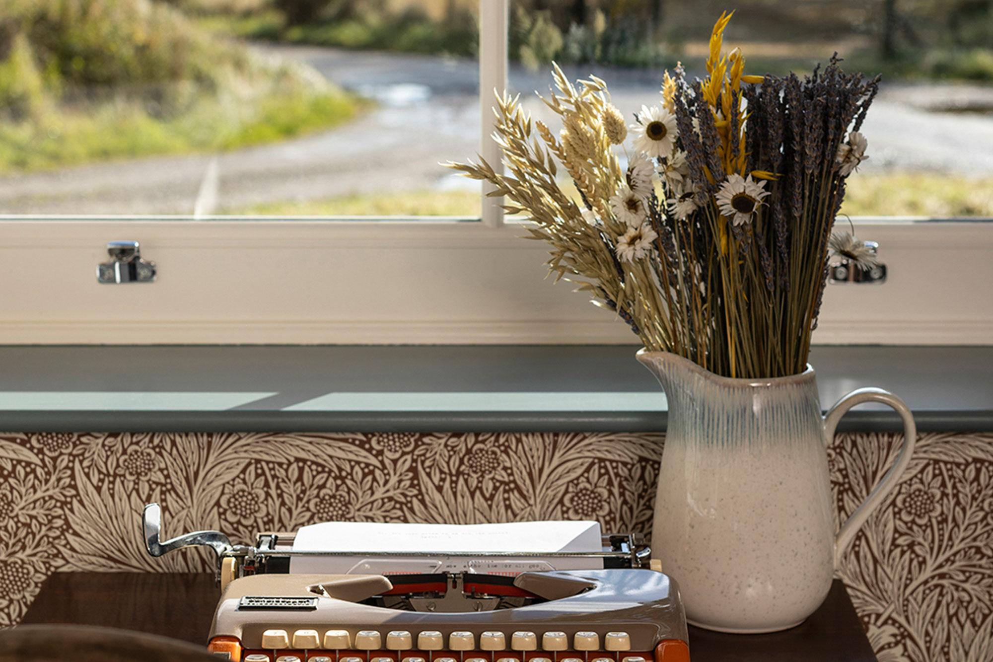 The living room is the perfect spot to kick back and relax with a large plush sofa beside the wood burning stove & a vintage-style record player to enjoy your favourite records. Floor to ceiling windows and sliding doors flood the room with natural light and frame uninterrupted views of the rolling hills beyond. Step straight out onto the private decking to soak up the scenery – a tranquil escape in every season.